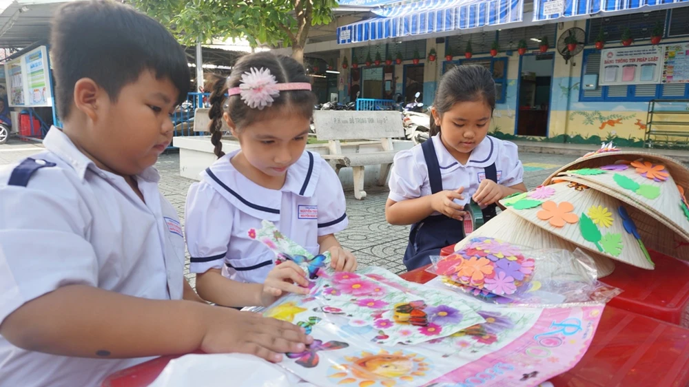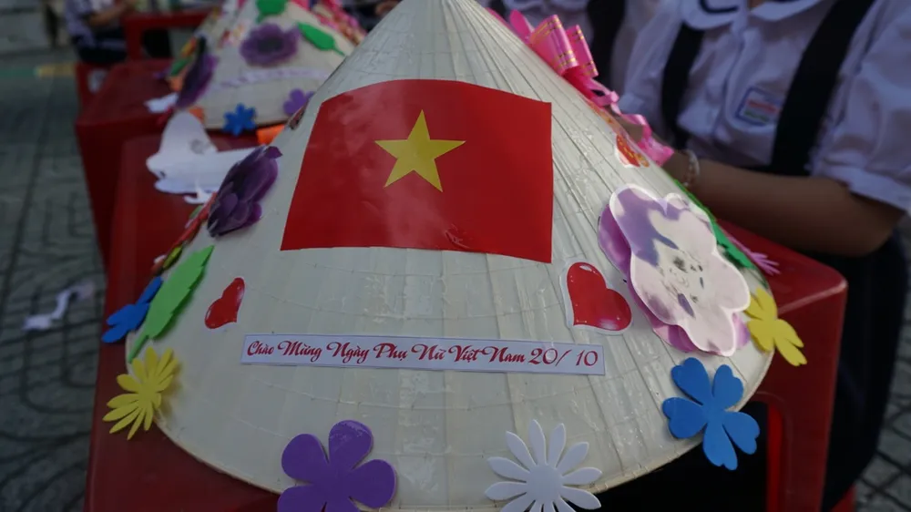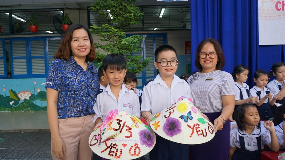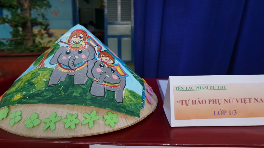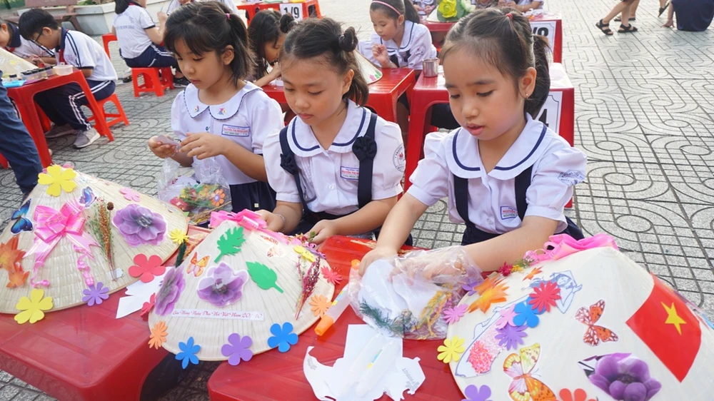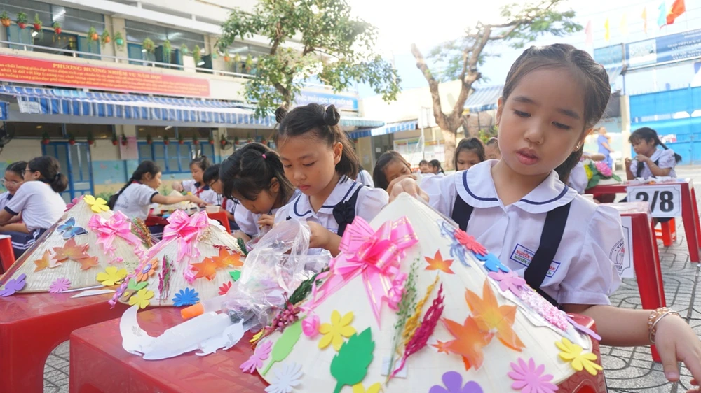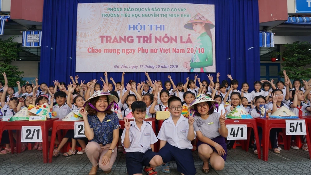 Sáng 17-10, Trường Tiểu học Nguyễn Thị Minh Khai, quận Gò Vấp tổ chức hội thi trang trí nón lá chào mừng ngày 20-10.
