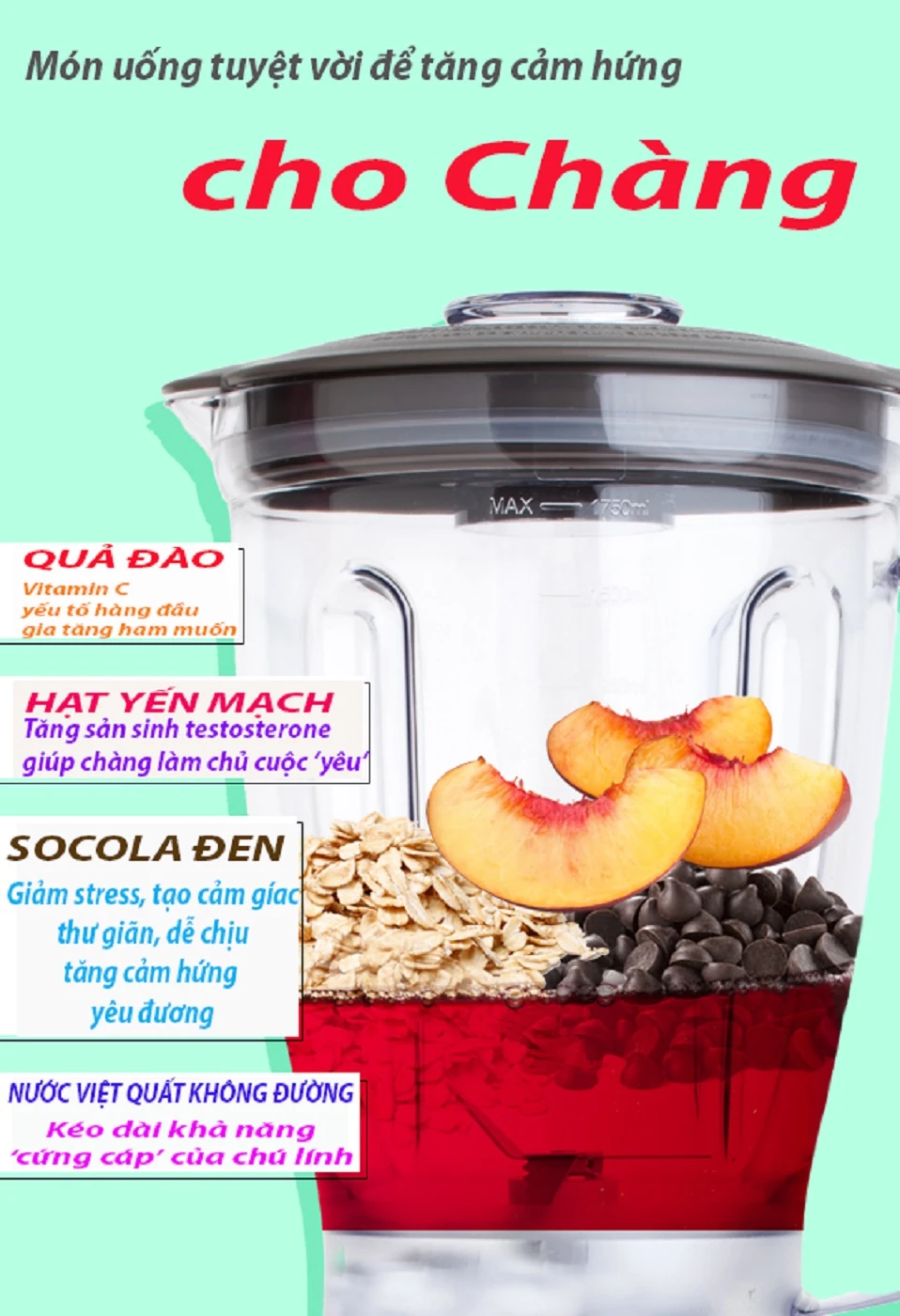 Đây là 4 loại thực phẩm đặc biệt có lợi cho việc tăng cảm hứng yêu đương cho phái mạnh. Trước đây bạn từng nghe nói nhiều đến những loại thực phẩm "tăng lửa" phòng the. Tuy nhiên, theo các nhà khoa học quả đào, hạt yến mạch, socola đen và nước việt quất là những món hữu hiệu hàng đầu.