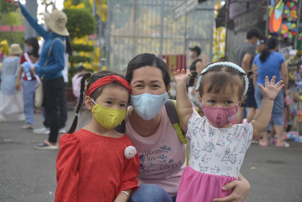 Tại Đường hoa Nguyễn Huệ, đường sách TP.HCM cũng tương tự. Chẳng cần nhắc nhở, người dân đều có ý thức phải mang khẩu trang đầy đủ khi du xuân chụp ảnh.