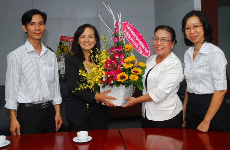 Đại diện Ủy ban Về người nước ngoài TP.HCM tặng lẵng hoa chúc mừng báo Pháp Luật TP.HCM. Ảnh: HTD