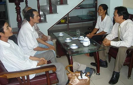 Hai người anh bị khuyết tật (bên trái) và mẹ bị cáo Trung (thứ hai, bên phải) đang nhờ Văn phòng luật sư Người Nghèo giúp đỡ. Ảnh: ĐT
