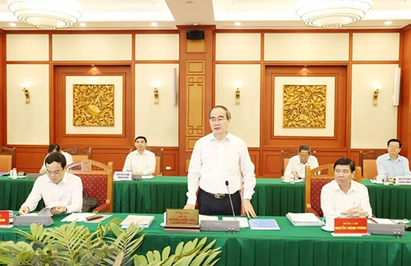 Ủy viên Bộ Chính trị, Bí thư Thành ủy TP.HCM Nguyễn Thiện Nhân phát biểu tại buổi làm việc. Ảnh: TTXVN