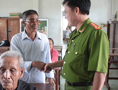 Đại tá Phạm Văn Hùng, Trưởng Công an huyện Châu Thành thăm hỏi ông Lá.