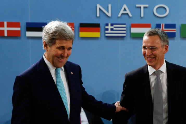 Ngoại trưởng Mỹ John Kerry cùng Tổng Thư ký NATO Jens Stoltenberg trong một cuộc họp của NATO. Ảnh: AFP