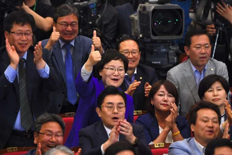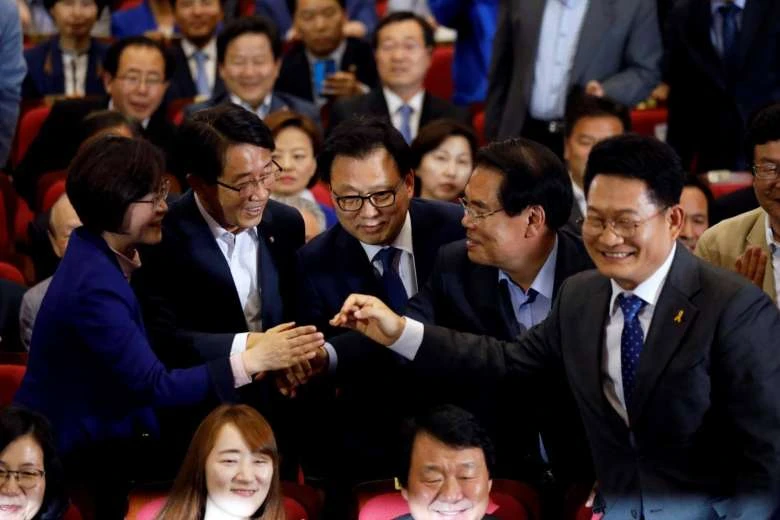 Các thành viên đảng Dân chủ của ông Moon Jae-in vui mừng trước các kết quả khảo sát. Ảnh: Reuters