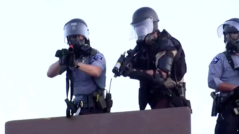 Cảnh sát Mỹ chỉa súng bắn cao su vào phóng viên Reuters TV khi đang tác nghiệp tại cuộc bạo loạn ở TP Minneapolis. Ảnh: REUTERS