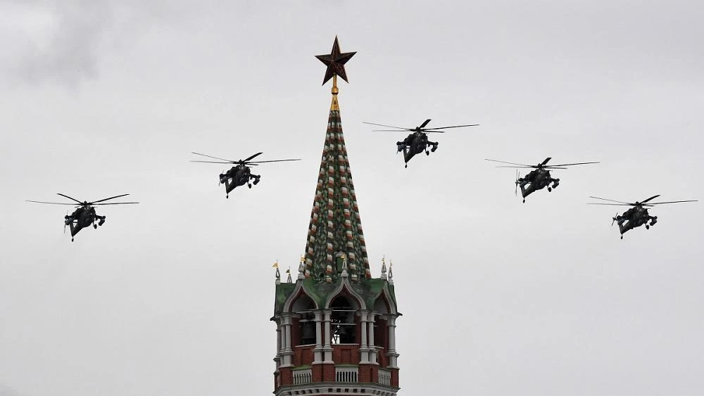 Trực thăng trên bầu trời Moscow kỷ niệm 75 năm ngày Chiến thắng phát xít 9-5. Ảnh: REUTERS