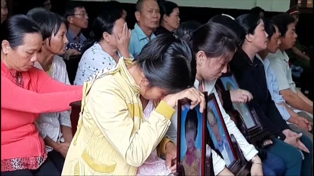 Gia đình bị hại đã mang di ảnh 3 nạn nhân đến tòa. Ảnh: HẢI DƯƠNG.