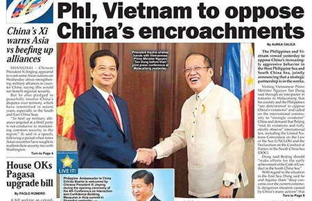 Báo The Philippine Star của Philippines ngày 22-5 đăng trên trang nhất bài viết với tựa đề “Philippines, Việt Nam chống Trung Quốc xâm lược”.