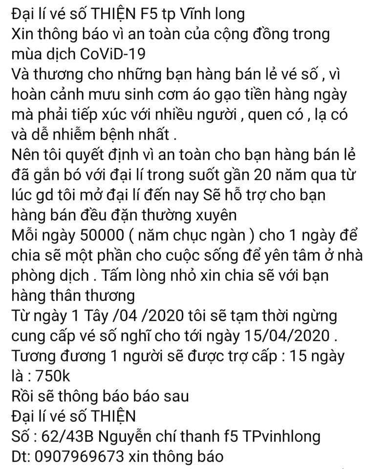 Sáng 30-3, trên mạng xã hội đã lan truyền thông tin về một chủ đại lý vé số ở Vĩnh Long thông báo sẽ hỗ trợ mỗi ngày 50.000 đồng cho những người bán vé số dạo thuộc đại lý của mình. Thời gian hỗ trợ là 15 ngày kể từ ngày dừng phát hành xổ số kiến thiết trên cả nước, bắt đầu từ ngày 1-4.