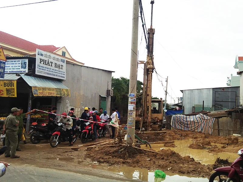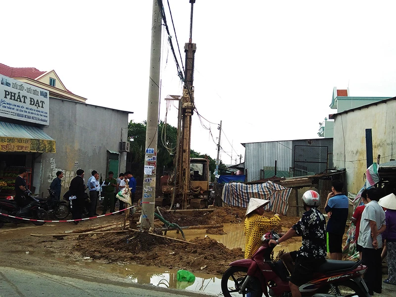 Ghi nhận tại hiện trường, phần trên không chiếc máy khoan chạm vào đường điện 3 pha kéo ngang vào nhà dân. Bên dưới mặt đất nhiều dây điện khác nằm ngổn ngang, chìm dưới hố nước công trình.