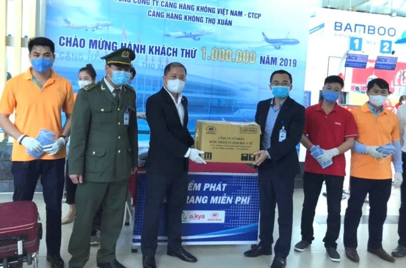 Khẩu trang y tế cũng được phát miễn phí tại Cảng hàng không Thọ Xuân, Thanh Hóa. Ảnh: SƠN NGỌC