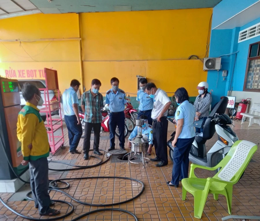 Lực lượng chức năng tỉnh An Giang kiểm tra thực tế các trụ bơm xăng. Ảnh: N.HỒ