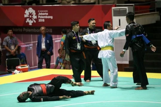 Ở bán kết hạng cân 90 kg pencak silat Asiad 18, võ sĩ Robial Sobri của Singapore đã bị võ sĩ Malaysia Sheik Alauddin đánh một phát vào lưng cực nặng khi đã bị đá té ngã.