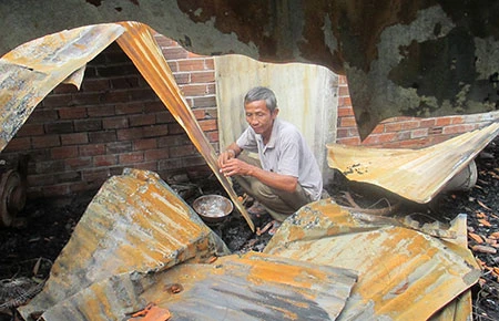 Ngồi giữa đống đổ nát của căn nhà vừa bị cháy, ông Suôl cố lục lọi tìm những vật dụng còn sót lại. Chỉ còn vài chiếc đinh, một chiếc liềm cháy cán và những tấm tôn cong vênh.