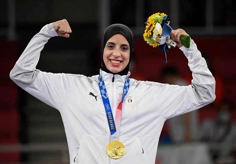 VĐV Feryal Abdelaziz lần đầu mang về tấm HCV nội dung đối kháng Karate hạng 61 kg nữ cho đoàn thể thao Ai Cập ở Olympic Tokyo. Ảnh: Getty