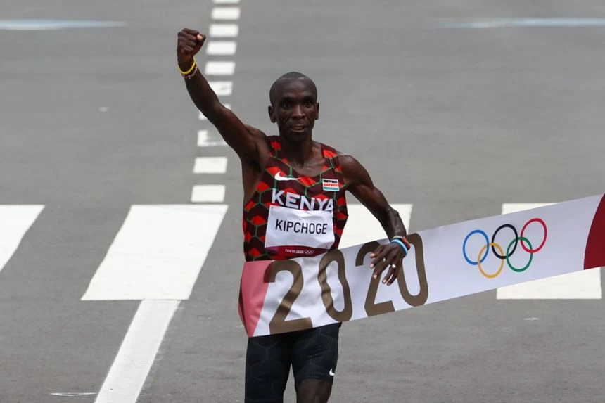 Eliud Kipchoge về nhất cự ly Marathon nam qua 2 giờ 8 phút 38 giây, đây là HCV Marathon thứ ba Olympic liên tiếp của VĐV Kenya 36 tuổi. Anh bước vào "ngôi đền những huyền thoại Marathon". Ảnh: Getty