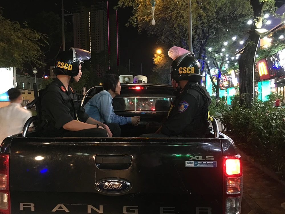 Đường Hồng Bàng (quận 5) đông phương tiện qua lại. Những ánh đèn led với dòng chữ Chúc mừng năm mới không làm lạc hướng nhìn của nhóm trinh sát. Hai người đàn ông đi chiếc xe tay ga cáu cạnh, nhìn phố phường và nói chuyện vui vẻ thì tiếng còi hụ cắt ngang.
