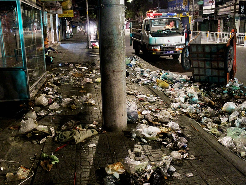 Người đàn ông ngoại quốc tông xe gom rác đẩy tay trên đường Quang Trung khiến rác thải văng tung tóe.