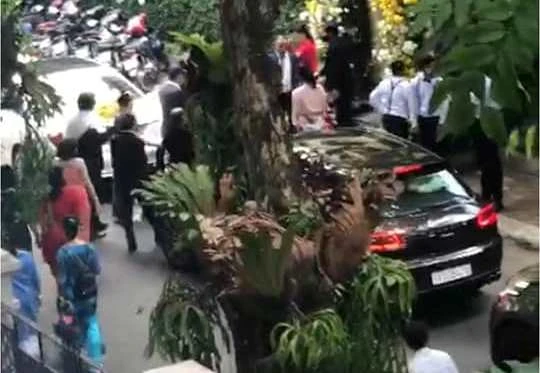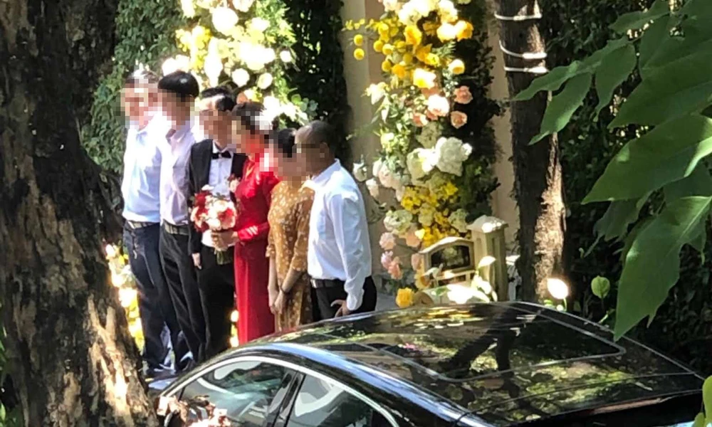 Theo nguồn tin của PLO, phía trước căn nhà này có dựng vòm hoa để mọi người chụp hình cùng cô dâu, chú rể... “Những người đến đây dự rồi chụp hình với cô dâu, chú rể đều không đeo khẩu tra” - nguồn tin nói thêm.