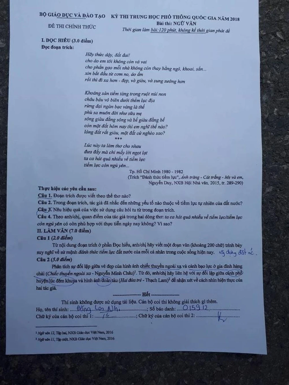 Đề thi văn THPT quốc gia năm 2018. Ảnh: NQ