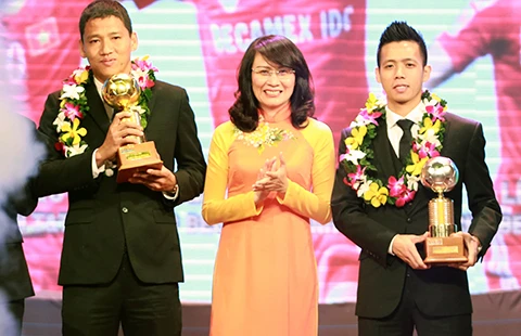 Anh Đức (trái) nhận giải Quả bóng vàng 2015. Ảnh: Xuân Huy