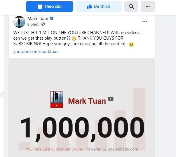 Tối ngày 20-1, kênh Youtube của Mark đã chính thức cán mốc 1 triệu lượt đăng ký.