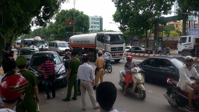 Theo những nhân chứng chứng kiến vụ việc: Chiếc ô tô đang chạy theo hướng Phạm Văn Đồng - cầu Mai Dịch (Cầu Giấy), khi đi đến gần ngã tư Phạm Văn Đồng- Hoàng Quốc Việt thì bất ngờ có 2 thanh niên đèo nhau trên một chiếc xe máy hiệu HonDa không biển số vượt trước ra hiệu cho chiếc ô tô dừng lại.