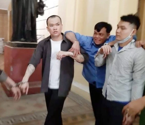 Trước đó khi được xe áp giải cùng các đồng phạm đến phiên xử, bị cáo Phúc được các đồng phạm dìu vào phòng xử do chân bị thương.