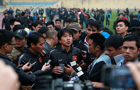 HLV Miura hạnh phúc trong vòng vây của người hâm mộ và báo chí sau trận giao hữu của U-23 Việt Nam với Hà Nội T&T trên sân Hàng Đẫy. Ảnh: QUANG THẮNG