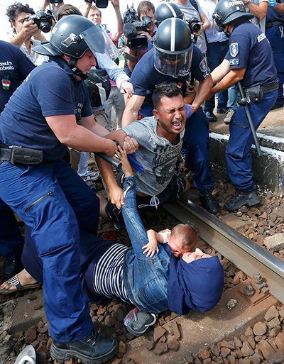 Tuyệt vọng khi bị ép rời khỏi chuyến tàu đi từ Budapest (Hungary) đến Vienna (Áo), người chồng đã đẩy vợ và con mình nằm giữa đường ray xe lửa. Cảnh sát chống bạo động đã phải dùng vũ lực để bắt giữ người tị nạn này. Ảnh: REUTERS