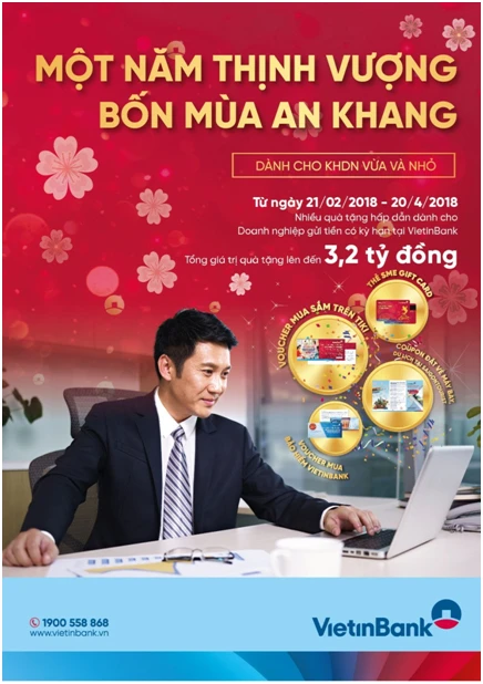Theo đó, khi gửi tiền có kỳ hạn tại VietinBank và đáp ứng điều kiện của chương trình, khách hàng SME sẽ nhận được các quà tặng hấp dẫn với tổng giá trị quà tặng trên 3,2 tỉ đồng như: Coupon tour du lịch trị giá 9 triệu đồng của Saigontourist; thẻ quà tặng trị giá 5 triệu đồng; voucher mua sắm hàng hóa dịch vụ trên tại Tiki.vn; coupon mua vé máy bay tại Saigontourist; voucher bảo hiểm của Công ty TNHH MTV Bảo hiểm Ngân hàng TMCP Công Thương Việt Nam (VBI).