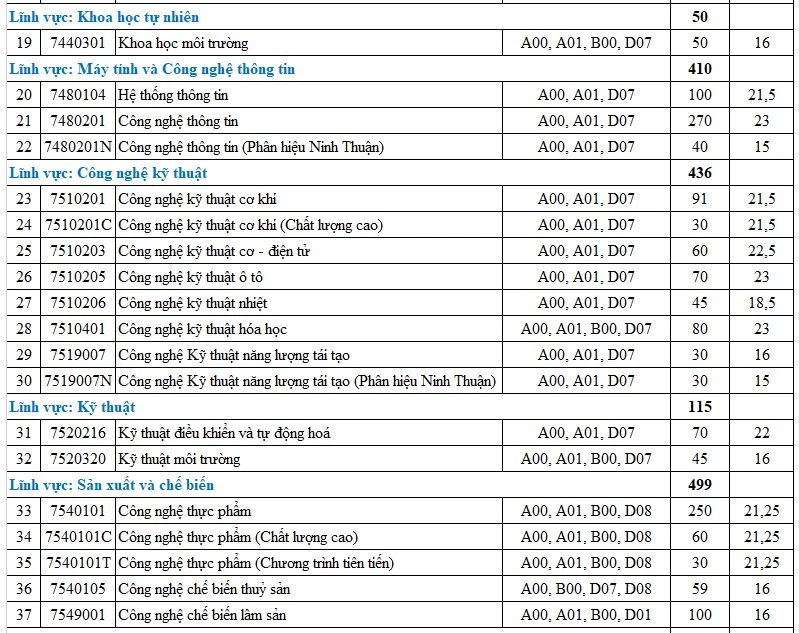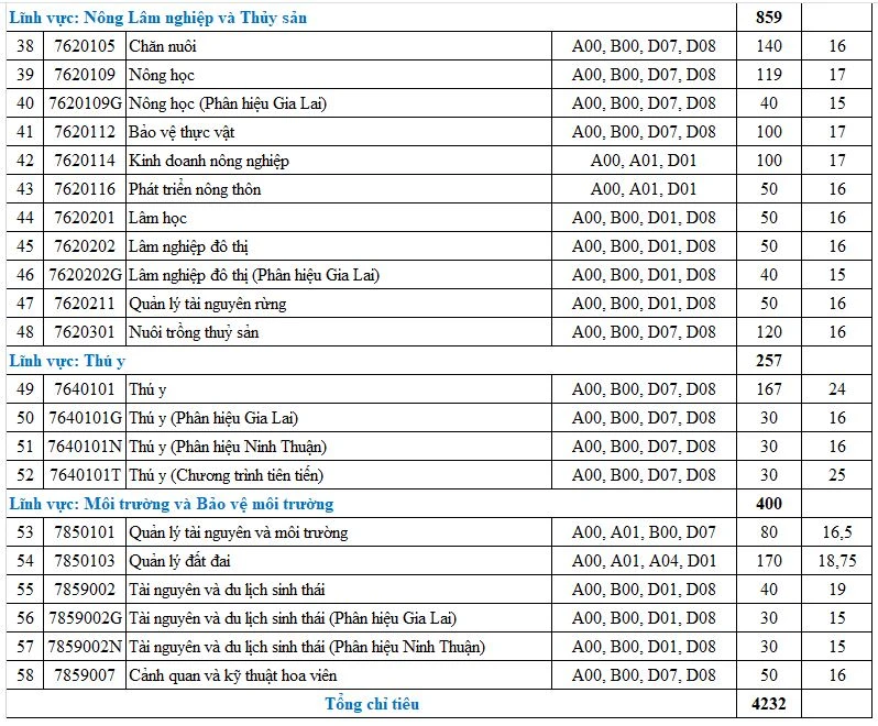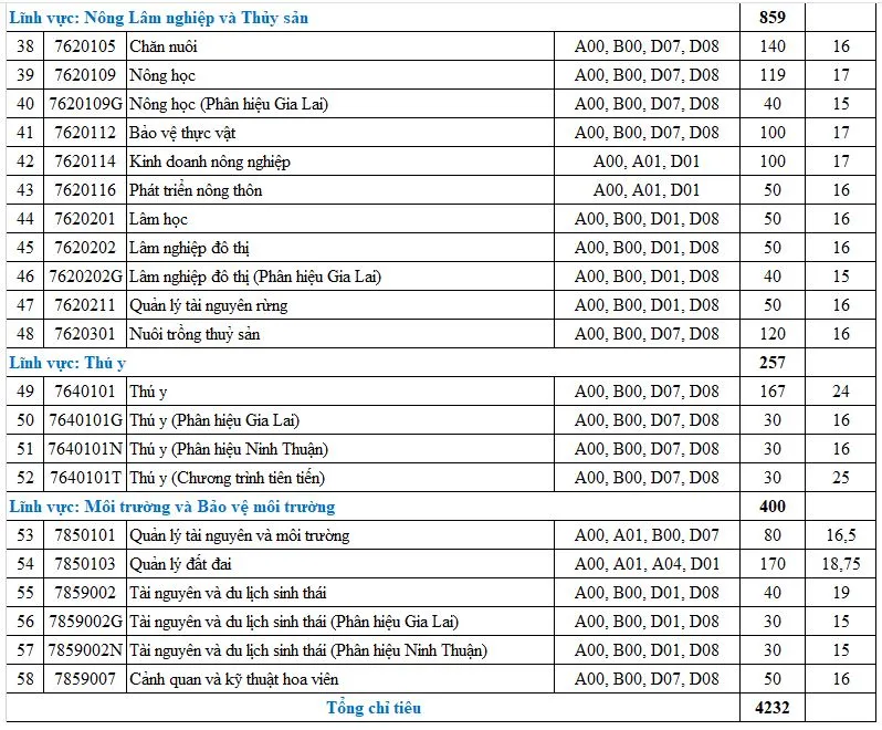 Theo đó, điểm chuẩn vào 58 ngành học của trường dao động từ 15 đến 25 điểm. Trong đó, nhóm ngành Thú ý có điểm cao nhất ở chương trình tiên tiến với 25 điểm và hệ đại trà 24 điểm, kế đến là các ngành về công nghệ thông tin, kế toán, công nghệ kỹ thuật tô tô...