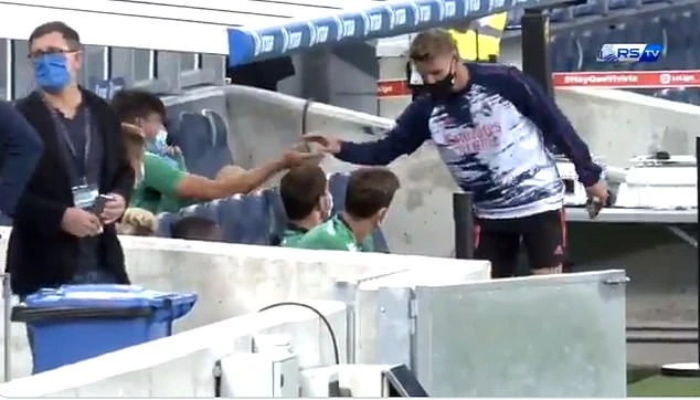 Hình ảnh Odegaard bắt tay với các cầu thủ dự bị Real Madrid.