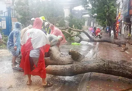 Nhân viên Công ty Công viên cây xanh Hà Nội đang xử lý sự cố cây đổ do bão số 1 gây ra. Ảnh: Phi Hùng
