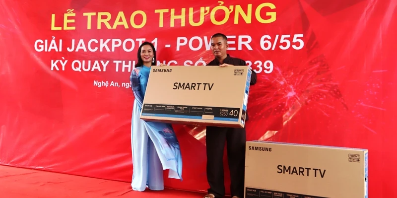 Gần trưa 15-10, tại TP Vinh (Nghệ An), Chi nhánh Hải Phòng (thuộc Công ty TNHH MTV Xổ số điện toán Việt Nam - Vietlott) đã tổ chức buổi lễ trao thưởng Jackpot 1 sản phẩm Power 6/55 kỳ QSMT số 00339 cho anh L. (ở Nghệ An).