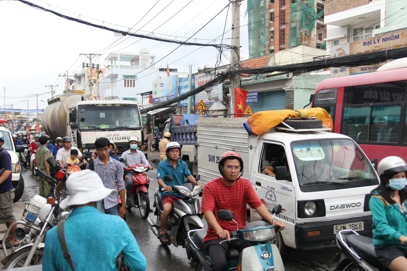 Kẹt xe hàng giờ tại khu vực xảy ra tai nạn thương tâm.Ảnh: HOÀNG GIANG