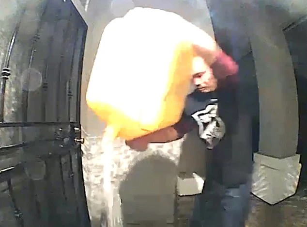 Cuong Pham được nhìn thấy đổ dầu lên cửa và thềm cửa nhà người hàng xóm. Ảnh: DAILY MAIL