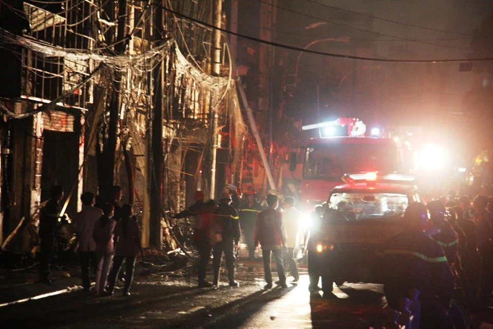 0 giờ 15 sáng 31-12, lính cứu hỏa vẫn đang ở trên xe thang, kéo vòi rồng phun nước. Hiện trường vẫn đang được phong tỏa trên diện rộng. Lửa đã được dập nhưng khói đen vẫn đang bốc lên ngùn ngụt trên nóc của quán karaoke.