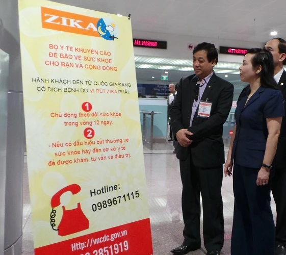 Bộ trưởng Bộ Y tế Nguyễn Thị Kim Tiến đang kiểm tra công tác phòng, chống dịch bệnh Zika tại cửa khẩu Tân Sơn Nhất (TP.HCM). Ảnh: TRẦN NGỌC
