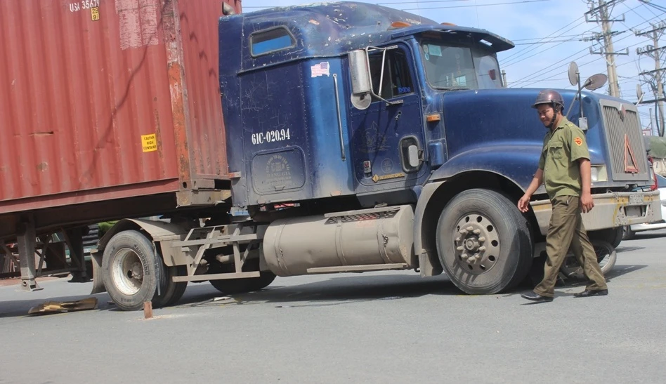 Trong lúc rẽ, bà T. bất ngờ bị xe container mang BKS: 61C-020.94 từ phía sau tông trúng khiến chiếc xe máy và nạn nhân văng xuống đường.