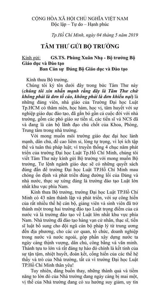 "Với mong muốn môi trường giáo dục đại học lành mạnh, dân chủ, đề cao liêm sỉ, lòng tự trọng, vì lợi ích tập thể và tuân thủ pháp luật; vì truyền thống hơn 40 năm phát triển của trường Đại học Luật TP.Hồ Chí Minh, chúng tôi viết tâm thư này kính gửi Bộ trưởng với mong muốn Bộ trưởng, Tư lệnh ngành giáo dục sẽ có những quyết sách đúng đắn để trường Đại học Luật TP.Hồ Chí Minh mau chóng ổn định và phát triển đúng đường lối của Đảng và nhà nước, thực sự xứng đáng là trường đào tạo Luật lớn nhất khu vực phía Nam", tâm thư viết.