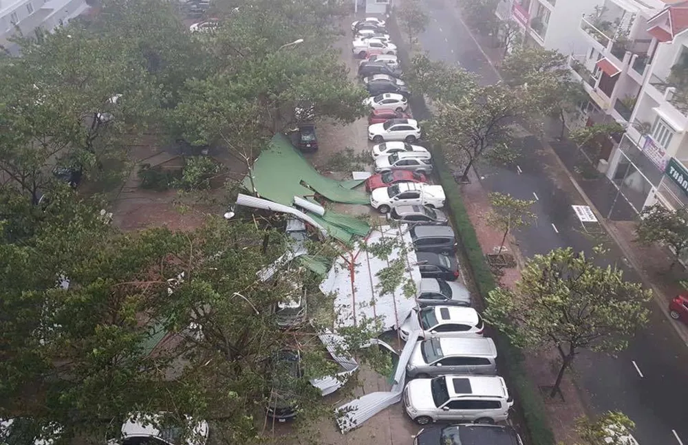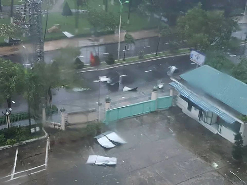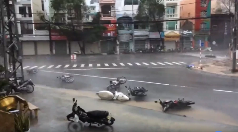 Trên đường phố Nha Trang tôn bay loạn xạ. Nhiều công trình bị hư hại, trụ bơm xăng gãy đổ...