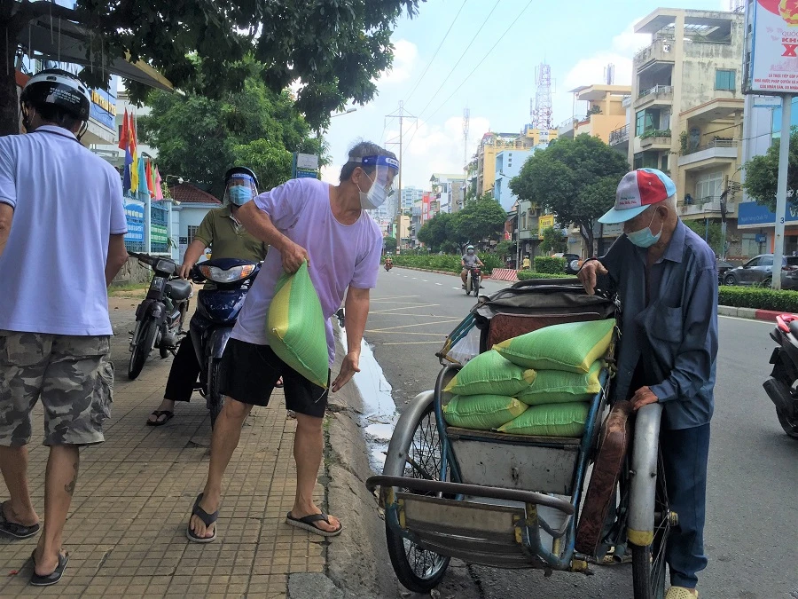 Người xích lô chở 60kg gạo thuê cho một khách hàng. ẢNH: TÚ UYÊN