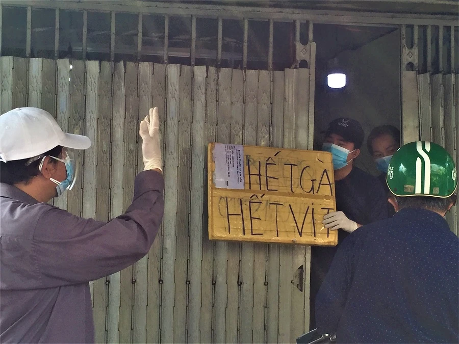 Tại một cửa hàng trứng gia cầm ở quận 11, nhiều người xếp hàng trước cửa. Chủ cửa hàng đóng kín cửa, phục vụ từng khách qua khe cửa hẹp.