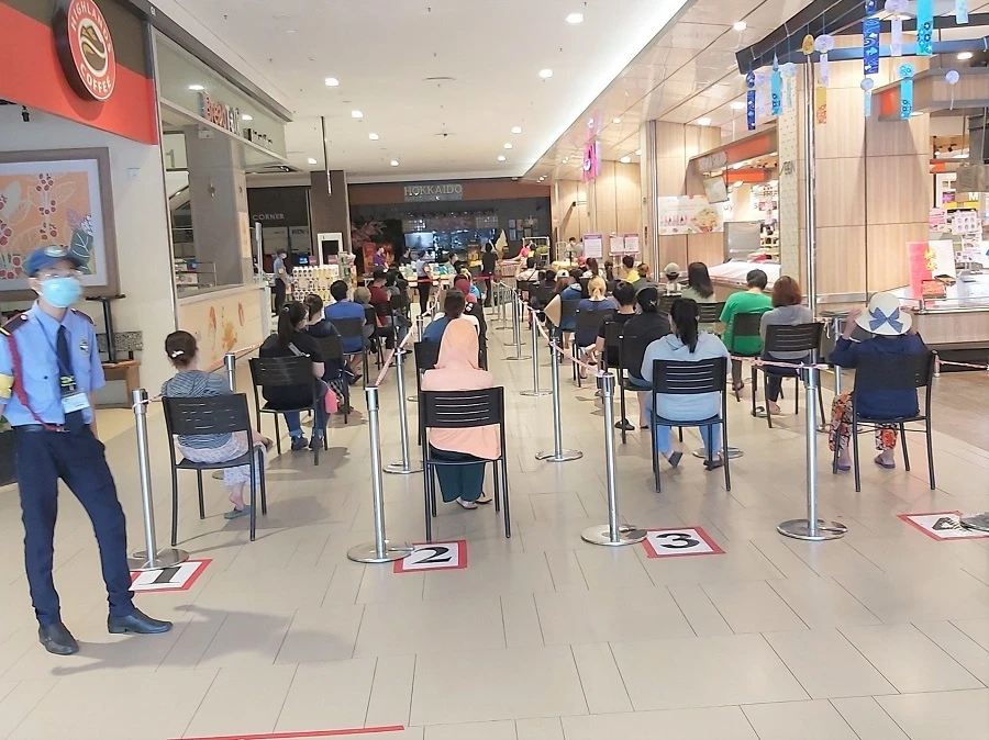 Khách hàng được sắp xếp chỗ ngồi đảm bảo giãn cách trước khi vào mua sắm tại Aeon Tân Phú. ẢNH: K.LINH