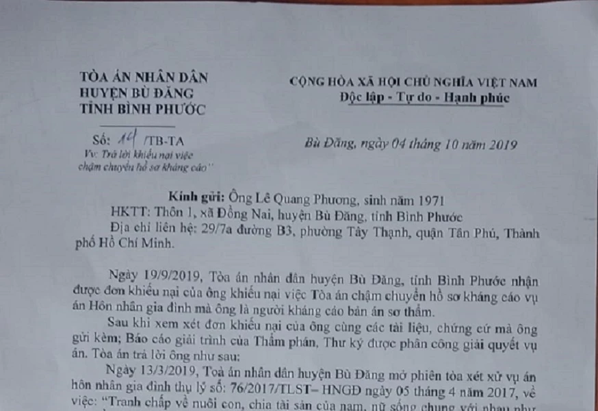 Ngày 4-10, TAND huyện Bù Đăng có văn bản trả lời khiếu nại của ông Lê Quang Phương về việc chậm chuyển hồ sơ kháng cáo vụ án hôn nhân gia đình đến TAND tỉnh Bình Phước.