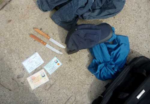 giấy tờ và dao trong cặp của nam thanh niên. Ảnh: V th.