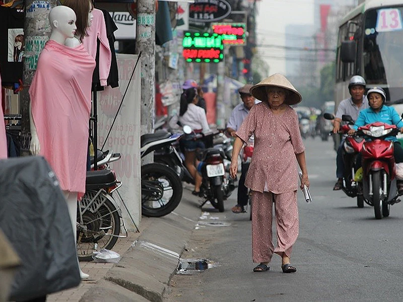 Cụ già đi dưới lòng đường bởi các hộ kinh doanh lấn chiếm vỉa hè trên đường Cách Mạng Tháng Tám, quận 3. Ảnh: HOÀNG GIANG
