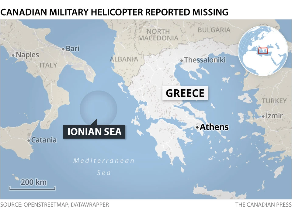 Vị trí rơi trực thăng Cyclone của quân đội Canada ở biển Ionia (vùng khoanh tròn). Ảnh: THE CANADIAN PRESS